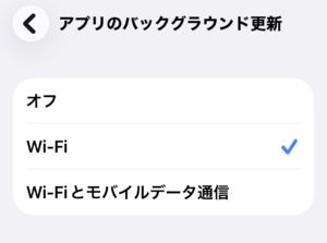 設定 → 一般 → アプリのバックグラウンド更新 → アプリのバックグラウンド更新 → Wi-Fi