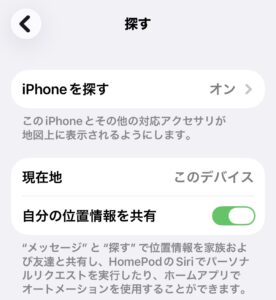 設定 → プライバシーとセキュリティ → 位置情報サービス → 位置情報を共有 → iPhoneを探す → 全てオン